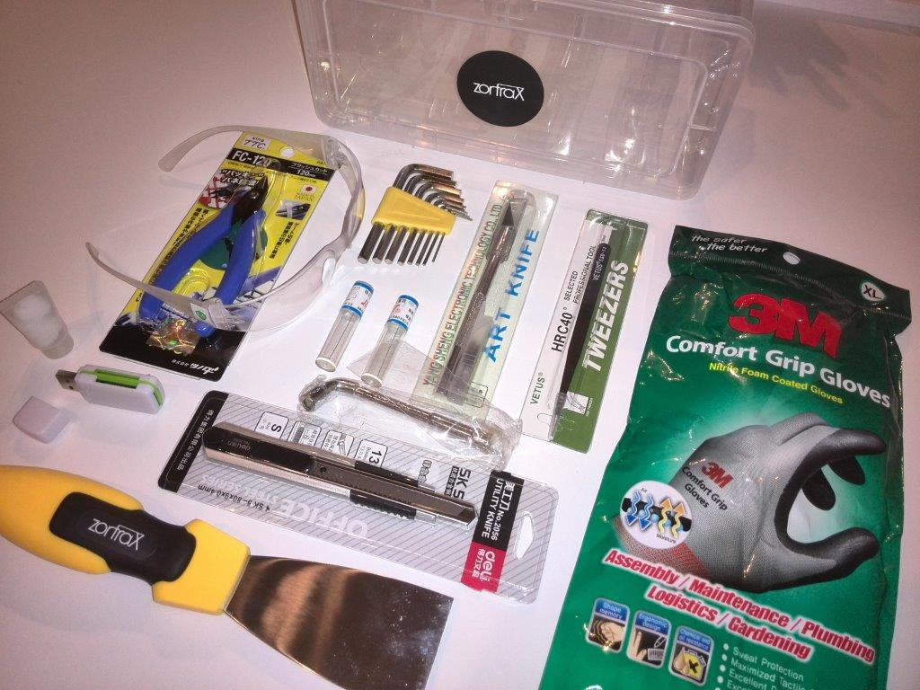 - Werkzeugset: Schutzbrille, Handschuhe, Spachtel, Cuttermesser, Seitenschneider, Skalpell. Drähte zur Reinigung der Düse, Schmiermittel, Pinzette, Imbusschlüssel-Set, SD-Kartenleser, ...