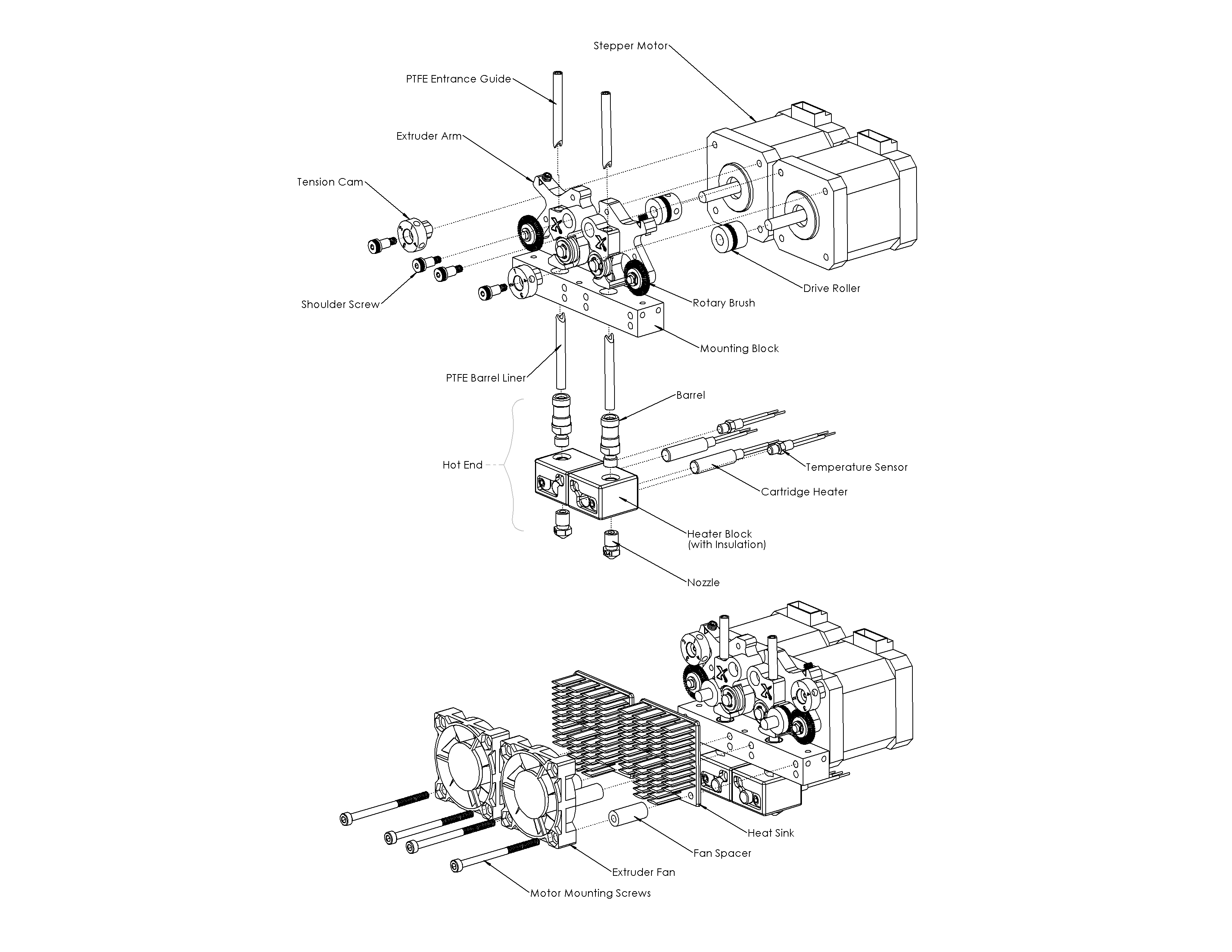 - Easy removal of the hotend without disassembling the motor and extruder (tool access between fan blades)