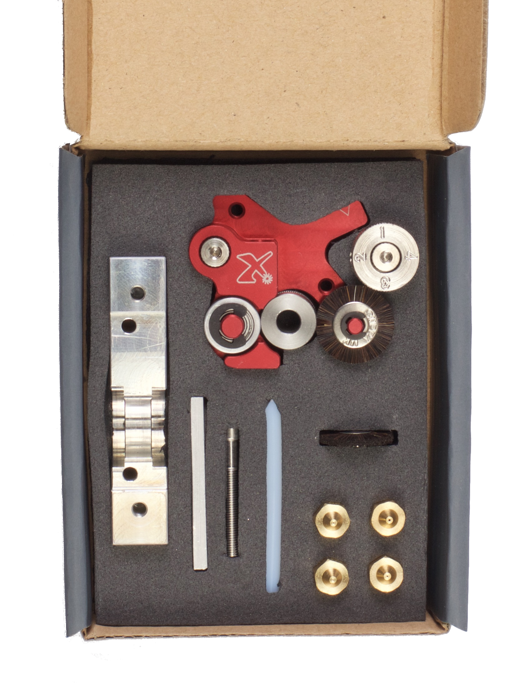 Dual E3D mount. Includes the mounting block and clamp plates, two mirrored Flexion Extruder drives, PTFE tubes for E3Dv6 hotend, and 4 nozzles: 0.3, 0.5, 0.6, 0.8. Does NOT include the E3D hotend, as pictured.