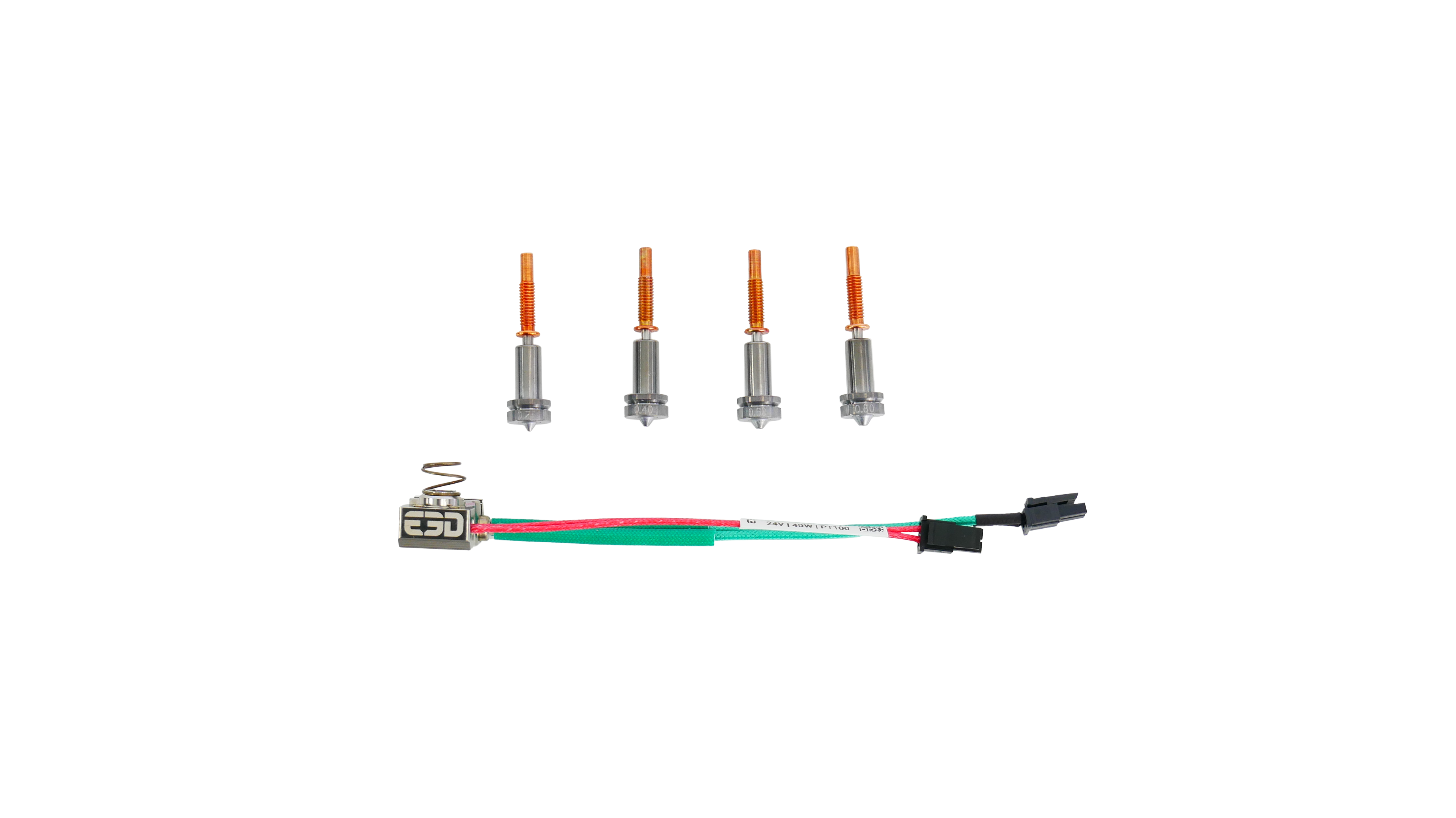 Fully customisable. Configure your ideal high temperature HotEnd. Choose between a PT100 or PT1000, as well as either a high precision heater cartridge (up to 400C) or high temperature heater cartridge (up to 500C).