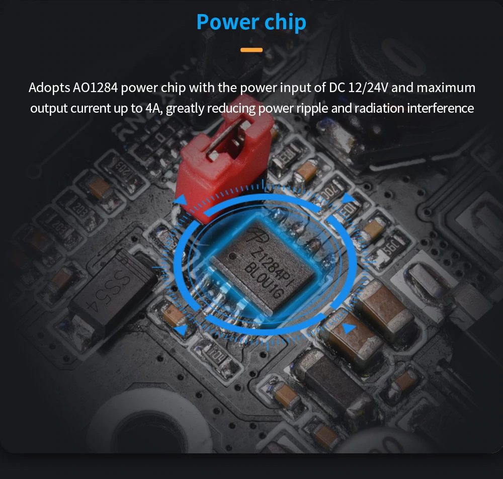 2. Adopts AO1284 power chip with the power input of DC 12/24V and maximum output current up to 4A, greatly reducing power ripple and radiation interference