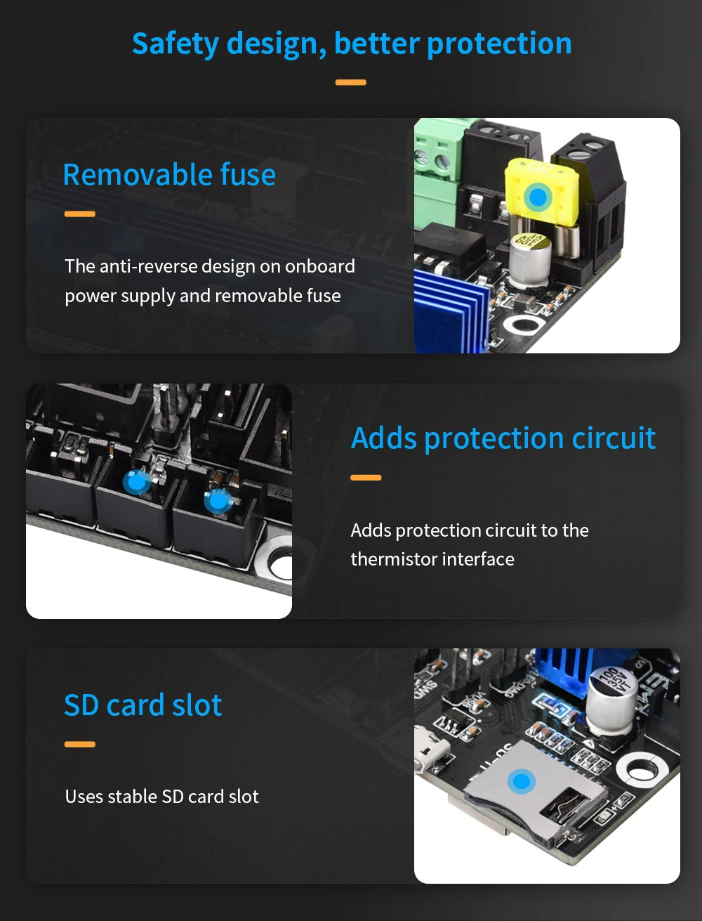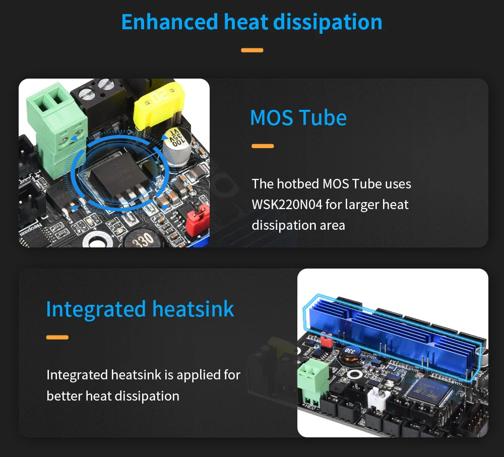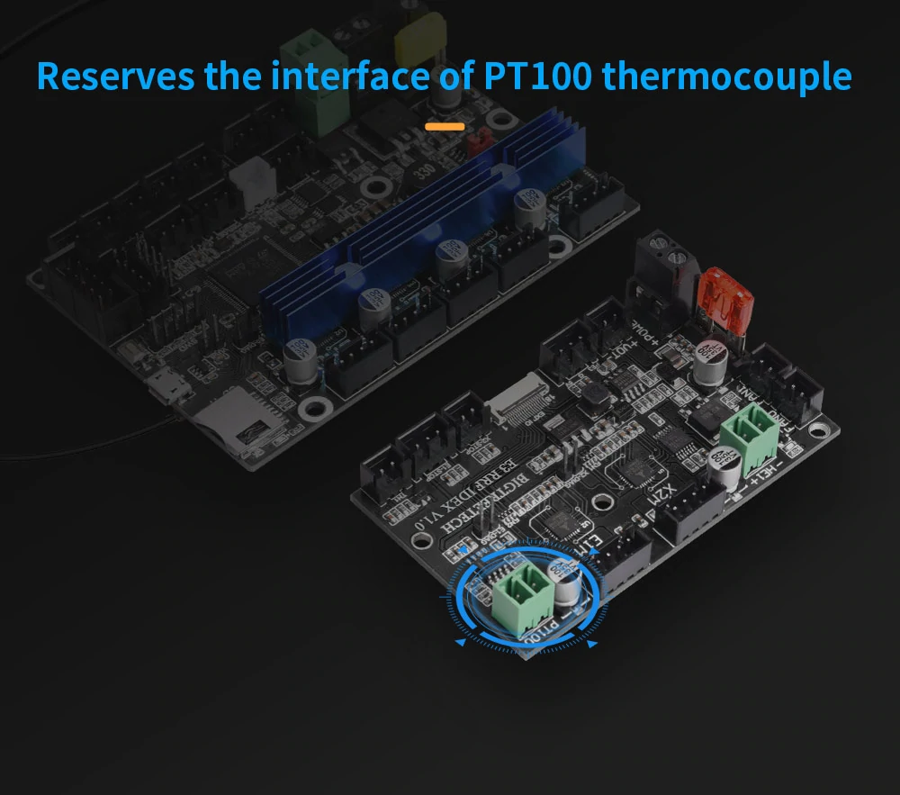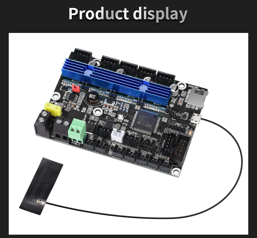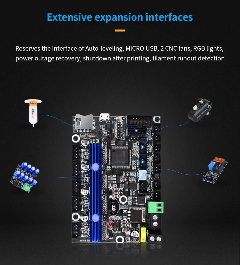4. Reserves the interface of Auto-leveling, MICRO USB, 2 CNC fans, RGB lights, power outage recovery, shutdown after printing, filament runout detection