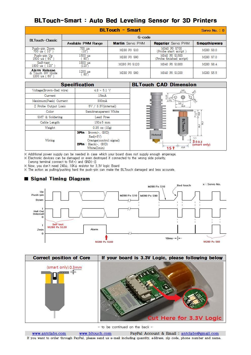 BLTouch is fulfilled with simple structure and high precision by using progressively designed solenoid and hall sensor. It aims for user convenience and enjoyable printing by adding many smart functions, such as self-test, alarm, alarm release & Touch Switch mode, Blue LED for servo signal indicating and Z-probe(Zmin) Testing.