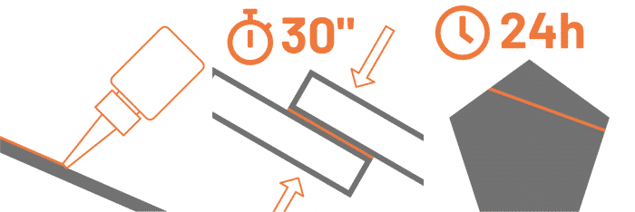 Die Kontaktflächen sollten trocken und frei von Verschmutzungen wie Öl oder Fett sein. Den Klebstoff sparsam auf eine Oberfläche auftragen. Sofort zusammendrücken. Drücke die Klebestelle für 15 bis 30Sekunden fest aneinander bis der Kleber aushärtet. Lass das Produkt für eine Weile ruhen, um dem Klebstoff Zeit zu geben damit dieser vollständig aushärtet. Nach 24h ist der Kleber vollständig ausgehärtet.