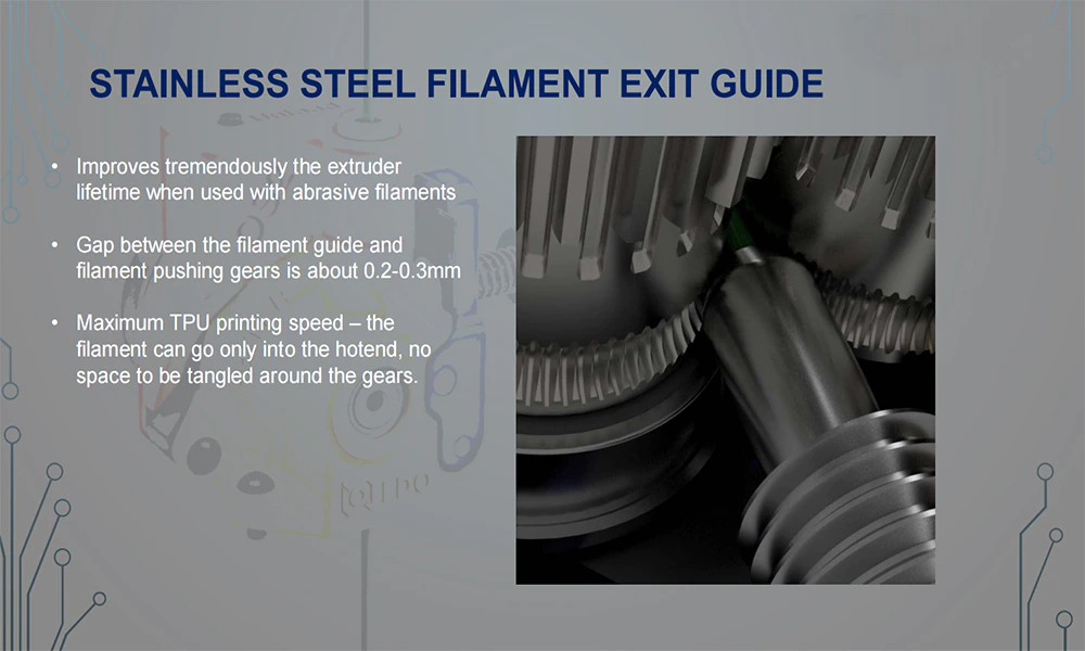 7. Stainless steel filament exit guide with 0.2-0.3mm clearance to drive gears for best TPU printing experience and extreme wear resistance when using abrasive filaments.