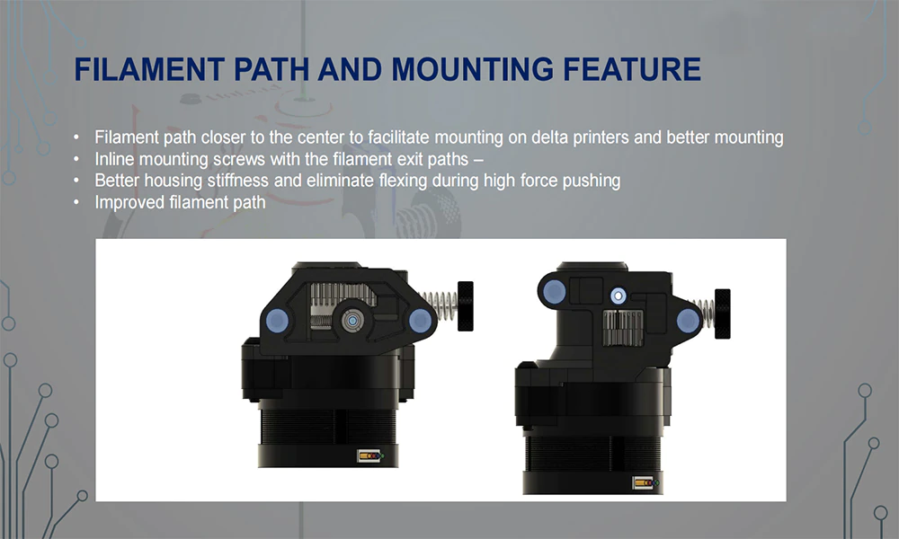 6. Flipped drive gears – filament path closer to the extruder center for a more balanced design and perfect fit on delta printers as well