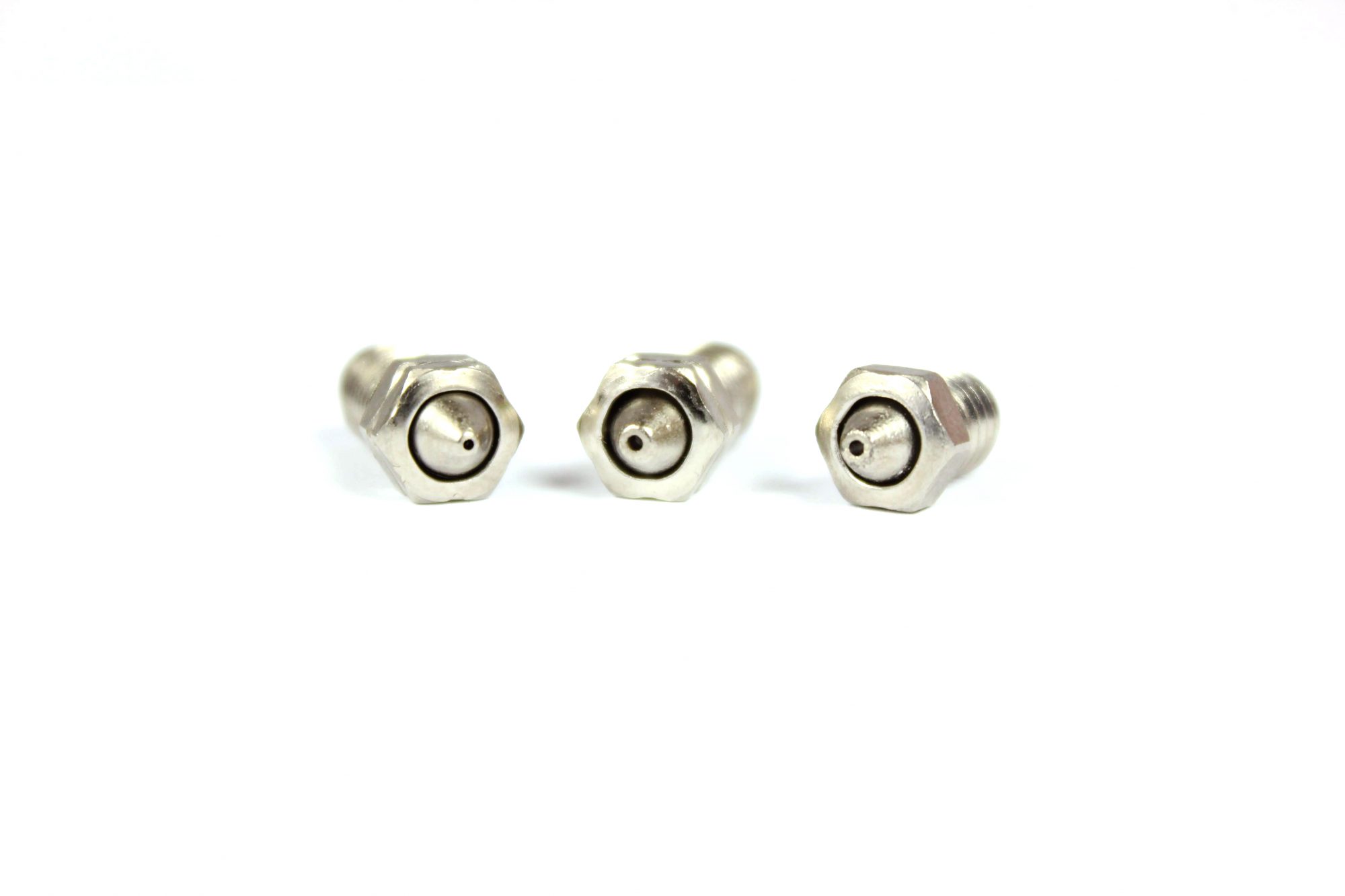 The whole nozzle is electroless nickel plated for enhanced slippery properties. Plastic will slide on the nozzle instead of sticking to it. This result is cleaner parts and less dragging problems.
