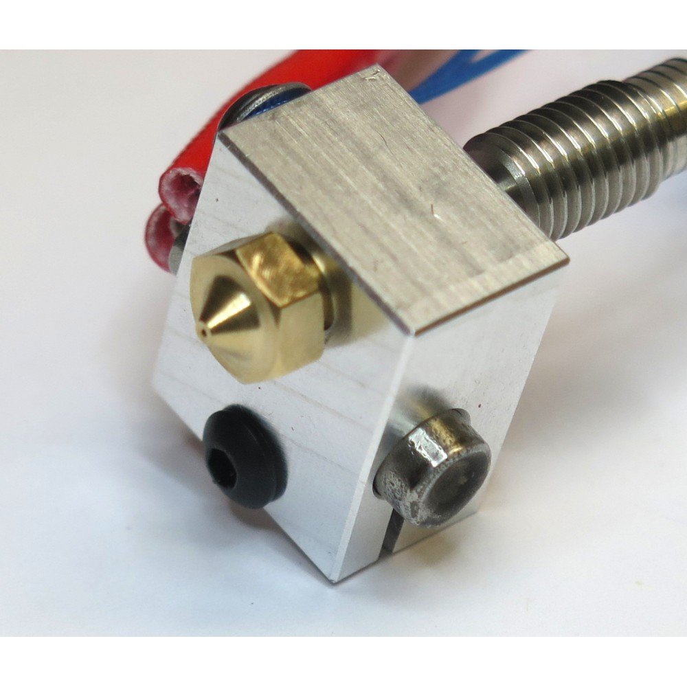 The v6 Heater Block has been upgraded to clamp both the heater cartridge and thermistor in place. These design improvements improve the thermal response of the HotEnd and make thermistor assembly easier.