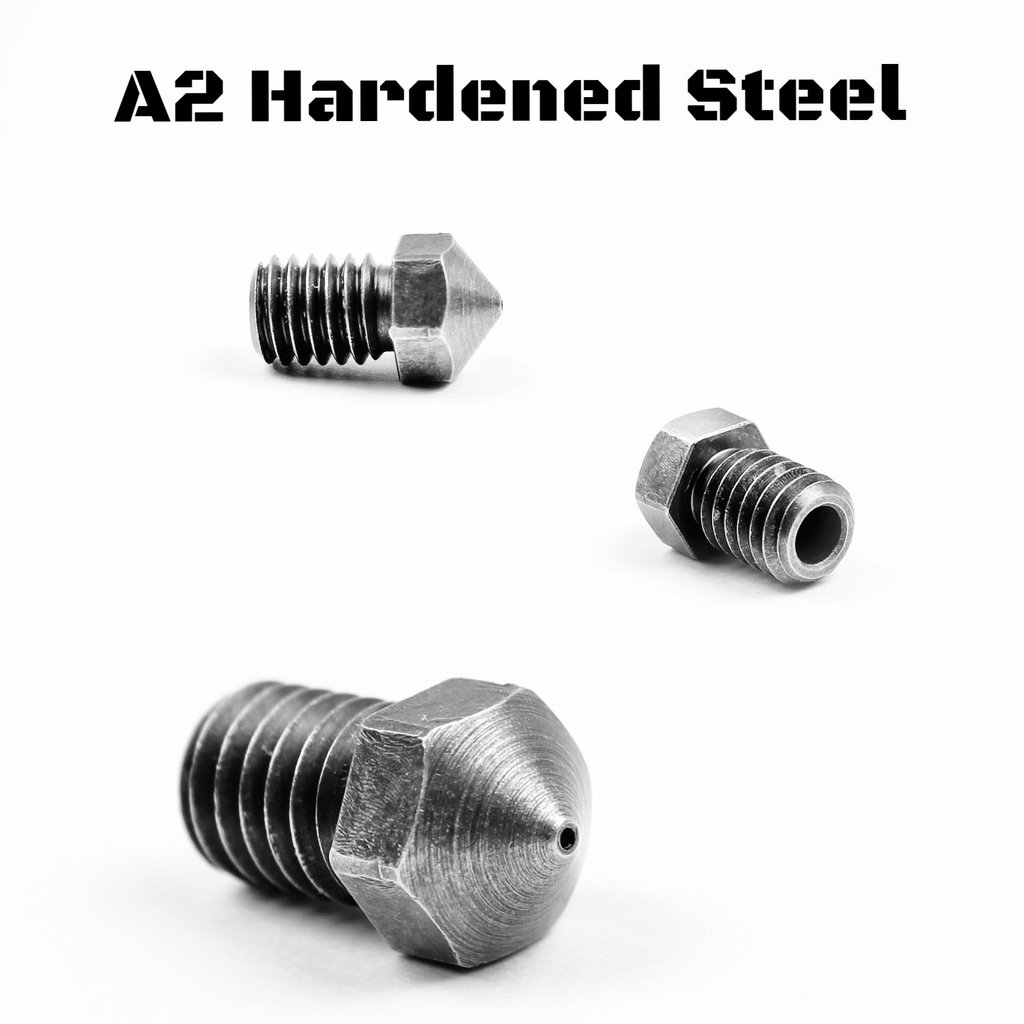 This is RepRap style nozzle, it is made from a A2 Tool Steel and heat treated to 57-62 RC. If you are working with abrasive Carbon Fiber, Stainless Steel, wood filled or any other metal filled filaments, this will greatly improve the life of your nozzle.