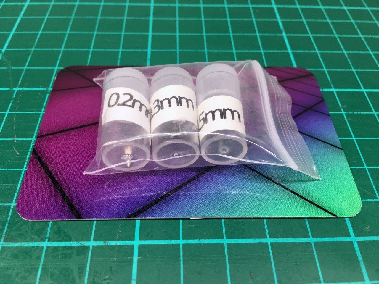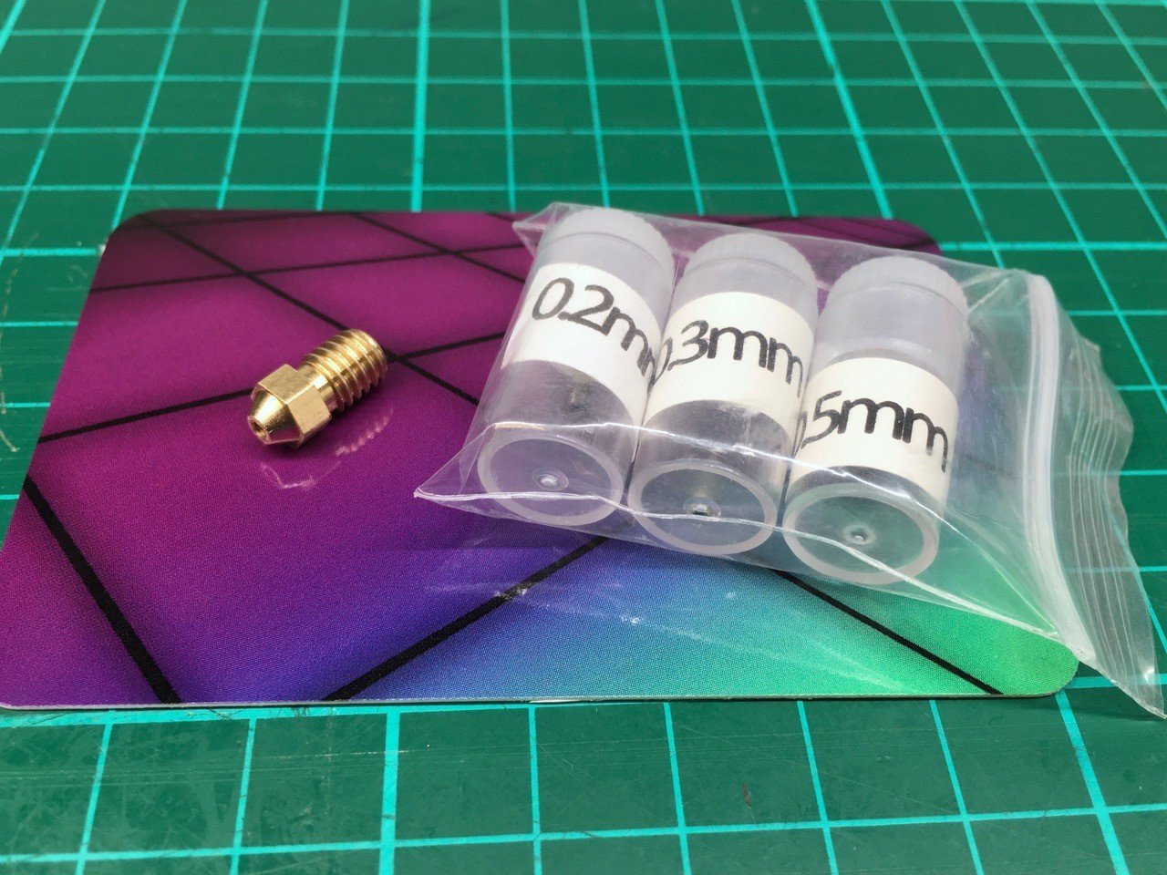 - Airbrush-Düsen sind sehr günstig in Größen von 0.2mm bis 0.5mm erhältlich, deutlich günstiger als herkömmliche 3D-Druckerdüsen.