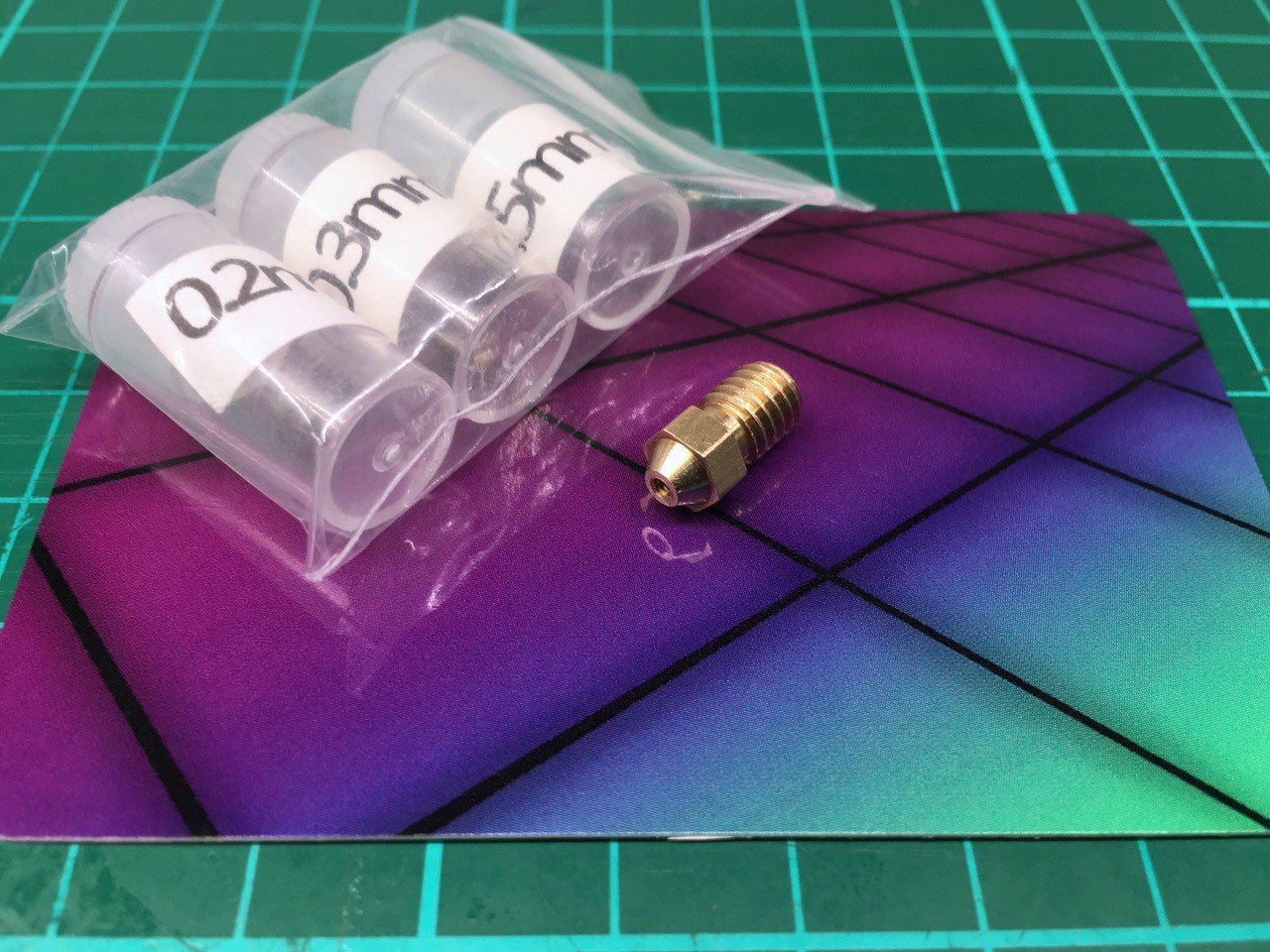 Mit dem hier erhältlichen Airbrushdüsen-Adapter hat man die Möglichkeit, diese kleinen Düsen in einen normalen Heizblock zu schrauben. Jedes Hotend mit M6-Gewinde passt hier: E3D, Hexagon, Lulzbot, Olson Block, Ultimaker 2+ und viele mehr.